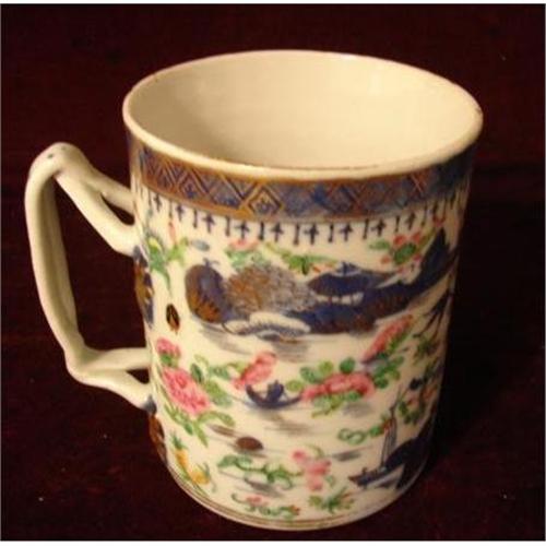 Circa 1780-1800 Chinese Export Clobbered Nanking HUGE Tankard/Mug Made for the English Market. The process clobbered is painting and gilding that is added to an already completed decoration. This lovely tankard is 4 7/8" in height and the diameter across the top opening is 3 7/8". The handle is a beautiful double strap that is in Perfect Condition. This lovely beautiful cider mug is in fabulous condition with only a bubble burst along the rim. No chips , cracks or Restoration to this Very Unusual Mug. This mug also has the "RARE" Beetle in the design.