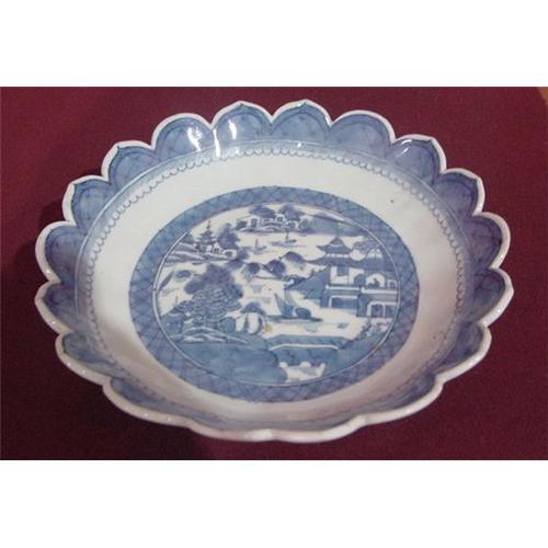 Circa 1850 Chinese Export Blue Canton Scalloped Saw Tooth Strawberry Bowl measuring 8" in diameter. Good Quality and Good Condition.