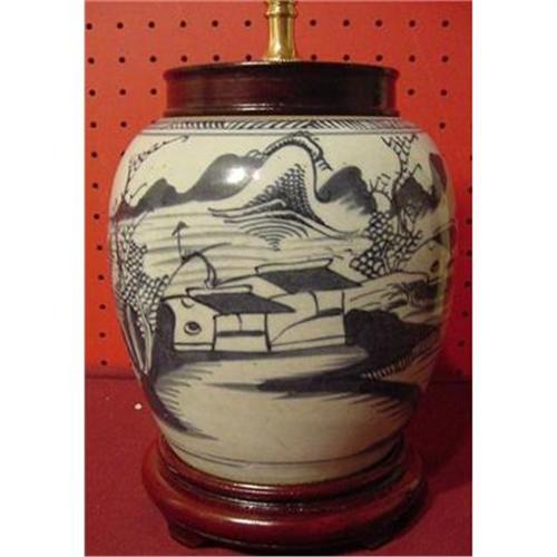 which measures over 20" to the top of the shade. Also included is the finial for the lamp. These ginger jars are not the true canton or nanking design but are referred to as double happiness and were probably made for the oriental taste and not that of the western world. But they fit in with all types of blue and white including canton that is very popular and make a very useful and decorative lamp.