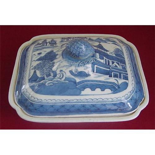 Circa 1840 Chinese Export Medium Blue Canton Covered Vegetable Dish with strawberry finial. This fine serving dish measures 9 1/2" X 8" and is 5 " in height to top of the finial. Nice Dark Blue Coloring and Good Quality with No Damage or Restoration. This is one of three covered vegetable tureens that we purchased out of Maine Estate this Summer. Excellent Condition.