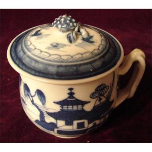 Circa 1840 Chinese Export Blue Canton Syllabub Cup with cover that has a nice strawberry finial. The handles on the cup are ehat is termed as double strapped as they entwine and cross each other. This cup measures 3 1/2" to the top of the finial. There is a nick at the bottom of the handle which we have shown on image #4. This might have been made in the making when it was fired in the kiln.
