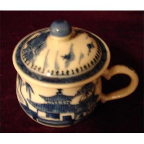 Circa 1880 Chinese Export Blue Canton Syllabub with Cover. Measures 3 1/4" in height to top of finial on cover and is 2 1/4" in diameter and 3" in diameter to the top of the handle. Nice blue canton decoration. Good Quality and in Excellent Condition. This form was made in canton, fitzhugh, and rose medallion. Syllabubs in Rose Medallion are ver rare since very few were made. You can tell this one is a late 19TH. Century syllabub as it has the round finial and plain handle and the earlier ones had a strawberry finial and double strapped handles. One of those would cost about $300.00.
