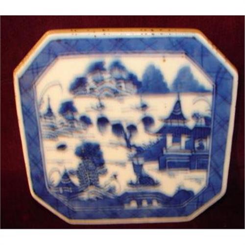 Circa 1840 Chinese Export Blue Canton Octagonal 8-Sided Tile. Nice blue canton decoration. Good Quality and in Excellent Condition. This form is very rare. These tiles were used as protection for table tops from hot tea and coffee pots. They came in shapes of round,four sided square, square with chamfored corners and octagonal shaped like this one. Few are seen in Blue Canton but we have never seen any in rose medallion, rose mandarin,1000 butterfly, fitzhugh, cabbage leaf, sacred bird and butterfly or other 19th century chinese export designs.Schiffer's Book on CHINESE EXPORT PORCELAIN shows a picture and a exact duplicate to this tile on page #212.