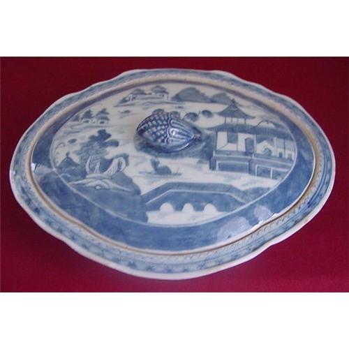 Circa 1840 Chinese Export Medium Blue Canton Diampond Shaped Vegetable Dish with Cover. This is one of three covered vegetable tureens that we purchased out of Maine Estate this Summer. This one measures 1 3/4" X 8 1/2" and is 4" to the top of the strawberry finial. Excellent Condition and Very Good Quality. No chips, cracks or restoration.