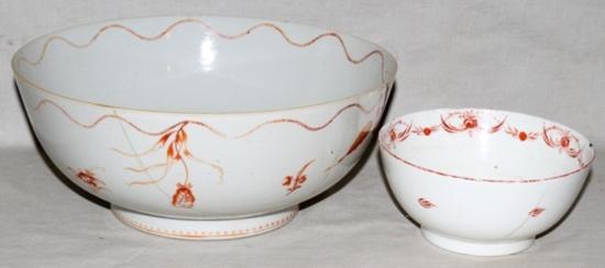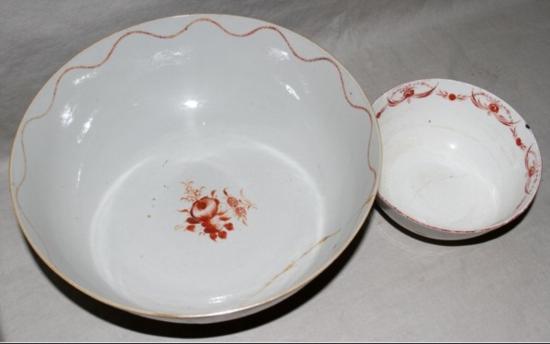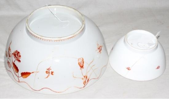 CHINESE EXPORT BOWLS, 18TH C., TWO, DIA 11" & 6", AS IS:Including 1 centerpiece bowl with orange on white floral decoration, H.5", Dia.11", and 1 other bowl, Dia.6". From the estate of Elsie Epstein