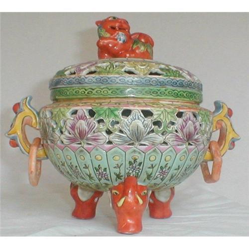 This is the most charming censer I have ever seen. Everything about this from the unique style, exquisite hand painted details, open reticulated vents, whimiscal foo on the lid, to the red elephant head (complete with tusks) tripod feet speak of all the great elements of a truly rare collectors piece.
