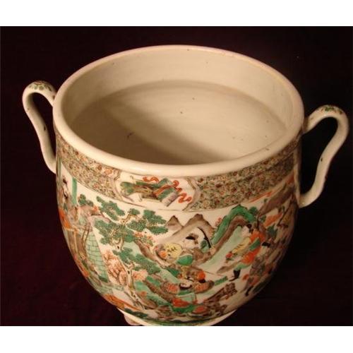 Circa 1840 Chinese Export Famille Verte VERY RARE Wine cooler. Great Colors and Detail. Measures 9 1/4" in height and measures 11" from handle to handle. Samuari Warriors w/horses and mountains in the background. There is a Star on the bottom of the piece but other than that there is no