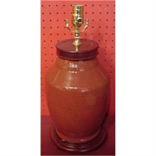 Circa 1880 Chinese Export Oxblood Vase measuring 15" in height having been made and electrified into a beautiful table lamp. Mounted on a nice rosewood stand plus fitted for a rosewood cover at top of opening. Also included is the harp, finial and the proper size shade. The term oxblood is also referred to as sang de boeuf.