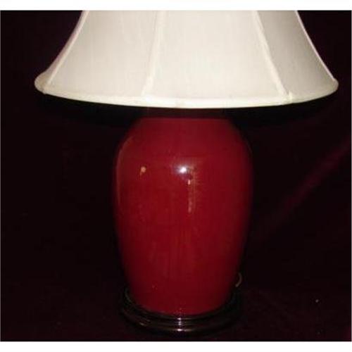 Circa 1880 Chinese Export Oxblood Vase measuring 13" in height converted and electrified into a beautiful table lamp. Mounted on a nice rosewood stand plus custom fitted for a rosewood cover at top of opening. Also included is the harp, finial and the proper lamp shade. Measures 27" to the top of the shade. The term oxblood is often referred to as sand de boeuf.