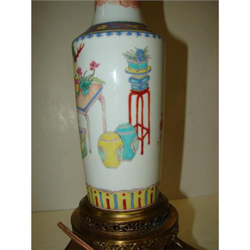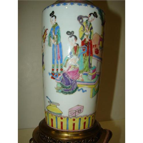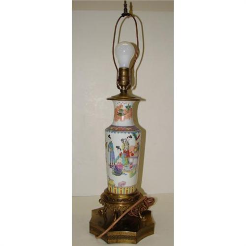 CHINESE EXPORT PORCELAIN LAMP. Mid 20th century. Figural brass base. Probably drilled through center. No apparent cracks. Porcelain 10.75” high.