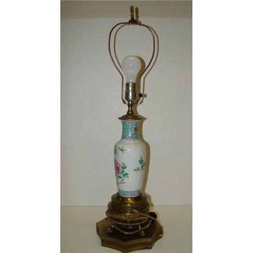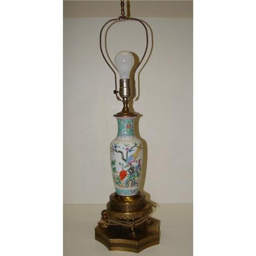 CHINESE EXPORT PORCELAIN LAMP. Probably late 19th/early 20th century, with decoration of peacocks in tree. No apparent cracks. Drilled through center. Porcelain 9.5” high.