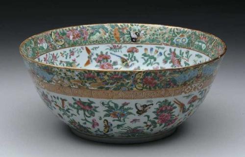 CHINESE EXPORT PUNCHBOWL. Famile Rose having sacred bird and butterfly design with Roman Key gilt outer border. Nice colors in a nice motif. Mid 19th Century. SIZE: 5-1/2” h x 12-3/4” dia. CONDITION: Very good. 9-27926