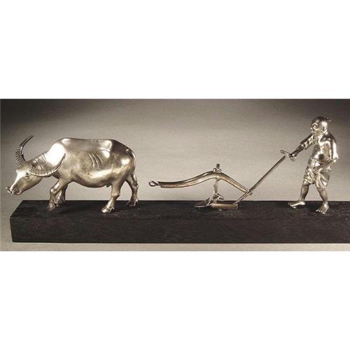 Hand made 19th century Chinese Export Qing Dynasty silver figural depicting yak and peasant pulling plow. Mounted on black stained wood base (not original). Excellent condition, dimensions - 10-3/8" wide and 3-1/2" high.