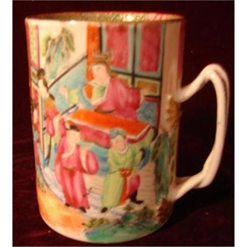 Circa 1820 Chinese Export HUGE Rose Mandarin Mug/Tankard with a double strapped handle.Measuring 5 1/4" in height. The top opening diameter is almost 3 7/8" in diameter No chips, cracks or Restoration is this most unusual Fabulous Mug. There is a tiny flea bite from a bubble that burst along the very rim. Excellent Quality with reserves of figures in a nice cartouche and a panel of birds and flowers. Wonderful Quality in Scenes and Enamels are absolutely Fantastic. The inside border is absolutely fantastic also. This is a very unusual large size and very few tankards are seen in Rose Mandarin. Most of these form were made in the 18TH Century.