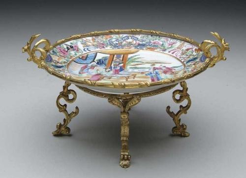 CHINESE EXPORT ROSE MANDARIN TRAY IN BRONZE STAND. Colorful plate is mounted in a bronze dore’ gilt footed stand. SIZE: 6-3/4”h x 12” w. CONDITION: Very good. 9-27904