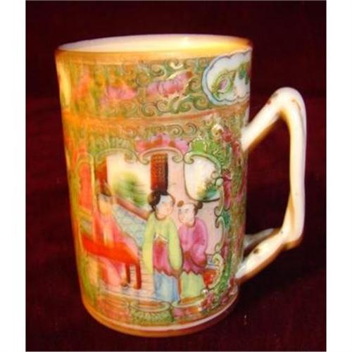 Circa 1840 Chinese Export Rose Medallion/Rose Mandarin Mug/Tankard with a double strapped handle. 3 1/2" in height and 2 1/2" in diameter at the top opening. Very Nice Quality with reserves of figures in a nice cartouche and a panel of birds and flowers. Slight hairline on the top rim and a small flaw on the bottom which appears to be in the making. This is a veruy unusual size and very few tankards are seen in rose medallion and rose mandarin. Most of these form were made in the 18TH Century.