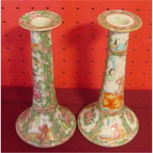 Circa 1880 Chinese Export Rose Medallion Pair of Assembled Candlesticks measuring 8" in height We bought hese out of a local estate as a pair but upon close examination there is a slight difference in the design. They are both the same height. Good Condition. Pairs of Rose Medallion Candlesticks are becoming as RARE as Blue Canton Candlesticks but at least have not risen to their $5,000.00 PRICE.