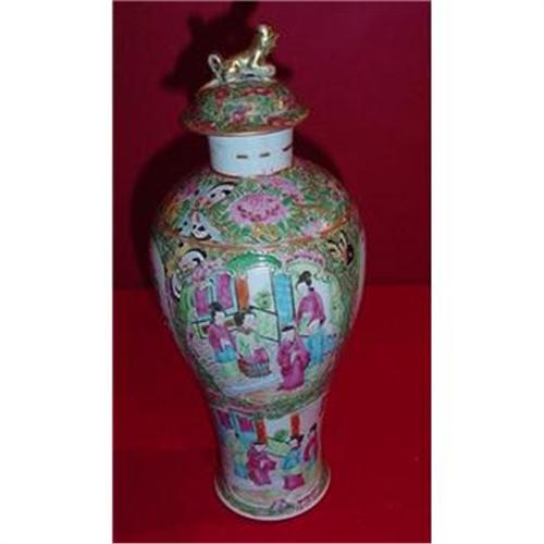 Circa 1840 Chinese Export Rose Medallion covered Balluster Vase from a Garniture Set. 11 1/2" in height to top of foo dog on cover. Nicely painted scenes of figures in garden scenes with gold in hair. Butterflies painted on the edge of each garden scene. Gilded foo dog mounted on top of cover.