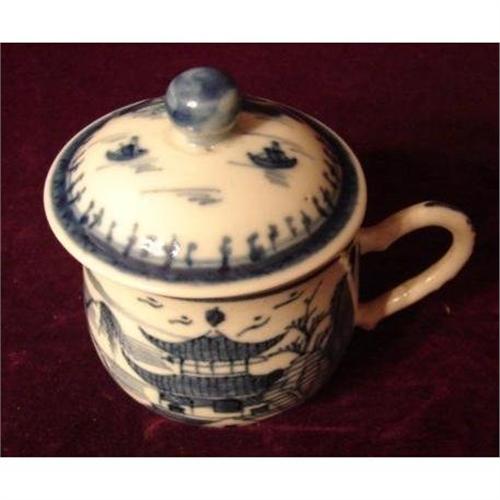 Circa 1880-1890 Chinese Export Blue Canton Syllabub Cup with Cover. 3" in height to the top of the round finial as opposed to a strawberry finial. This one has a plain handle, as opposed to a double strapped entwined handle. We only mention this as most of the syllabubs made earlier to 1890 has the cross strapped handle and the strawberry finial.