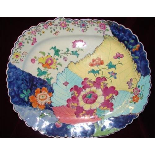 Circa 1770 Chinese Export RARE Scalloped Edge Tobacco Leaf Platter measuring 17" X 14" X 1 1/2" in Depth. GUARANTEED TO BE THE REAL DEAL 100%. This is Good as it Gets. It is oval in shape with a scalloped edge that comes to a little point on top. The colors are bright and crisp and the tobacco leaf design is truly gorgeous and just breath taking as are all the other VIVID Colors in this wonderful design. Sime very Minor Slight Wear to the outer edge and a few scratches to the platter itself apparently when used as a a meat platter many, many years ago. I am jus mentioning this and the wear is very minor. The Colors are Extremely Vibrant in this Platter. On January 26,2006 at Christe's New York Auction during Americana Week there were two tobacco leaf platters that were offered for sale. We do not know the condition of these platters. A 12 1/8"