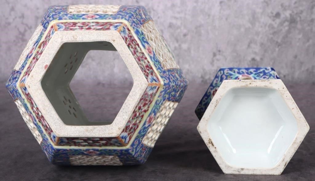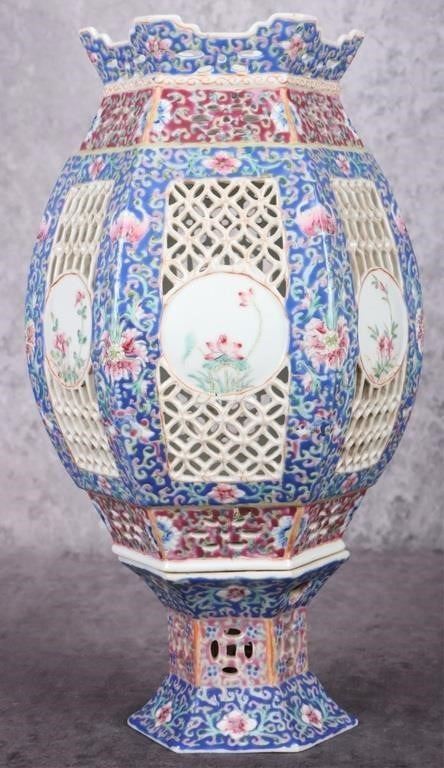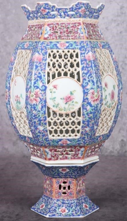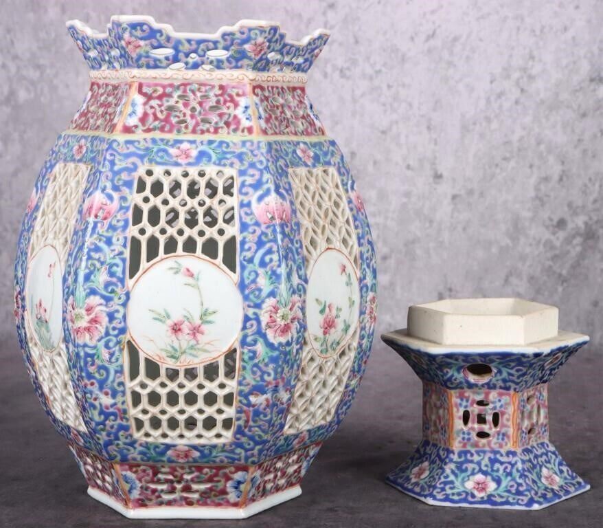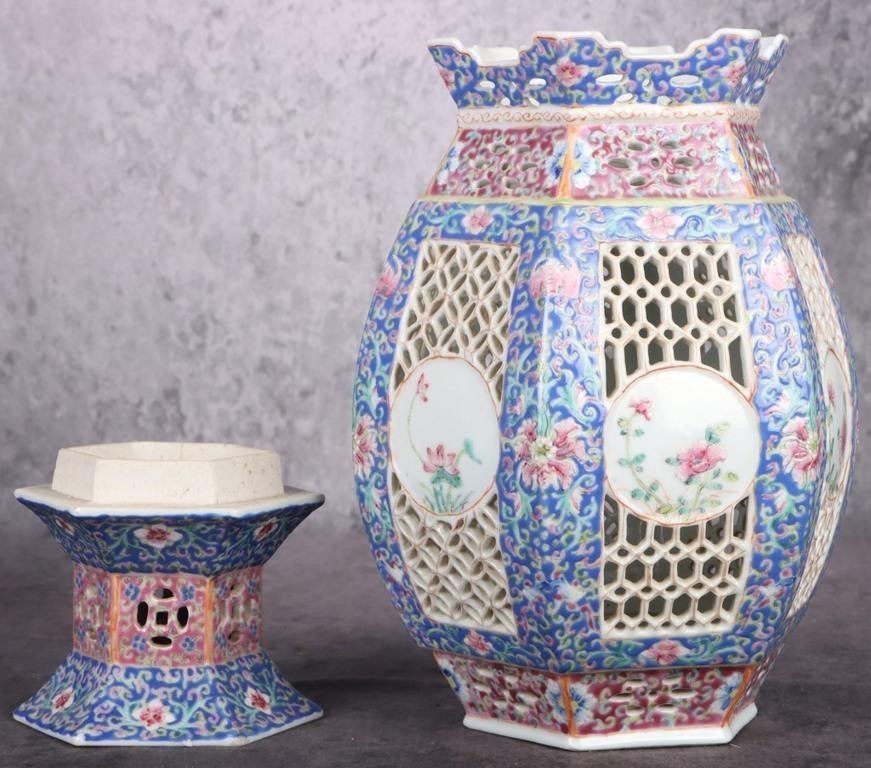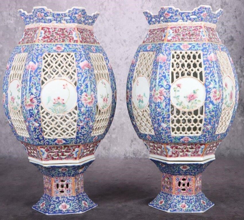 Chinese Famille Rose Porcelain Lamp Lantern Qing - Republic set of 2. On each side there is a round medallion with a miniature portrait of flowers. The medallions evoke the image of moon gate as if the beauty and flowers are seen through the moon gate. These lanterns are adorned with beautiful pinks, blue and greens. On the lower and upper sections near the foot of the lantern, two twin coin shaped openings are carved to allow better circulation of air for better burning of the candle or lamp. The stand has a cup that can hold a candle or small lamp. The lantern body has intricately carved beautiful classical window lattice openings.