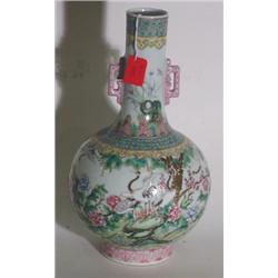 CHINESE FAMILLE ROSE DECORATED PORCELAIN VASE, last half 19th century, bearing a Chien Lung mark, 1736-1795, of orb form with cylindrical neck, with finely detailed colorful design depicting animals in a forest setting around the entire circumference; 14 inch height