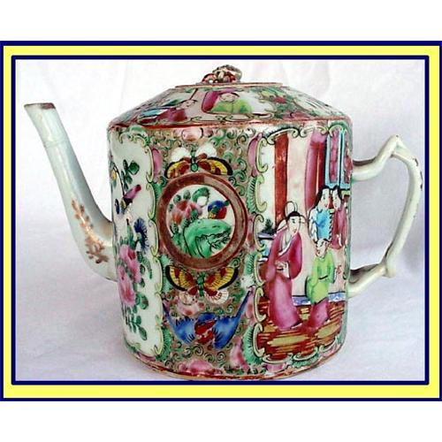 Chinese Rose Medallion teapot and lid. 19th century.<BR>3 1/4 inches high.<BR>Rich enamelled and gilded teapot. Panels with flowers, birds, butterflies and people pursueing various activities. The lid fits snugly into the sloping top of the teapot. Moulded flower finial. Handles in the form of twisted branches, highlighted with gilding and at join with pot, relief raised floral modelling. <BR>Very good condition - no chips/cracks/damage.