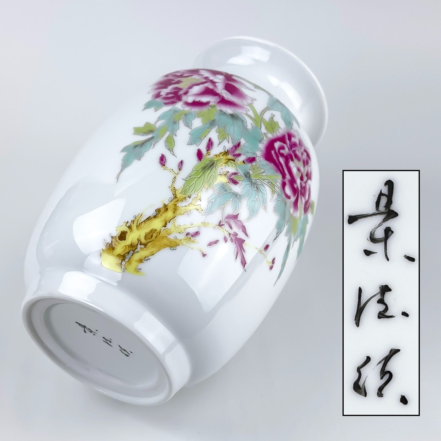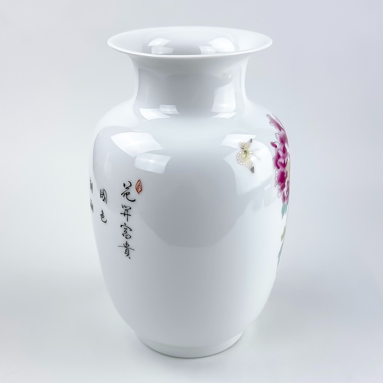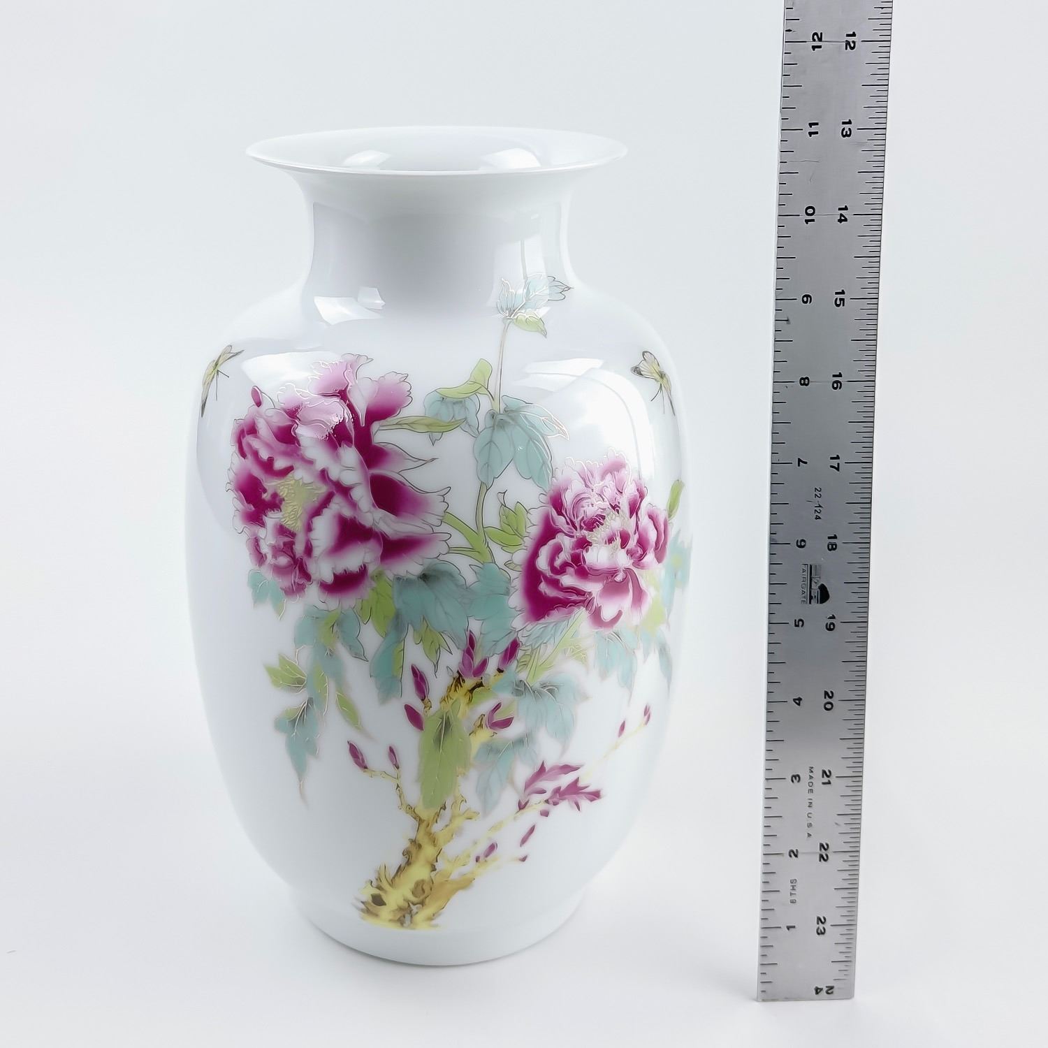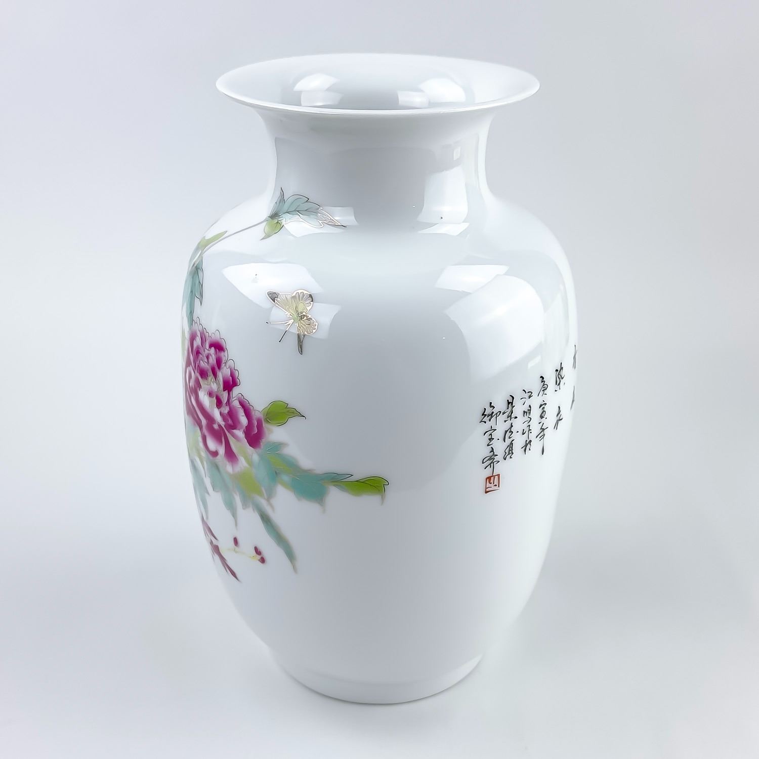#8438 - CHINESE FAMILLE ROSE STYLE PORCELAIN FLOWER VASE. FLORAL PEONY FLOWERS WITH BUTTERFLIES DESIGN AND CHINESE CALLIGRAPHIES ON THE BACK AND BASE. EXACT AGE AND ORIGIN UNKNOWN. HOME OR OFFICE DECOR ART SCULPTURE. NO CRACKS, CHIPS OR REPAIRS. MEASURES 10.5” (27 CM) TALL BY APPROX 6.5” (16.5 CM) WIDEST DIAMETER AND 4.75” (12 CM) TOP DIAMETER. BASE DIAMETER 4” (10 CM).