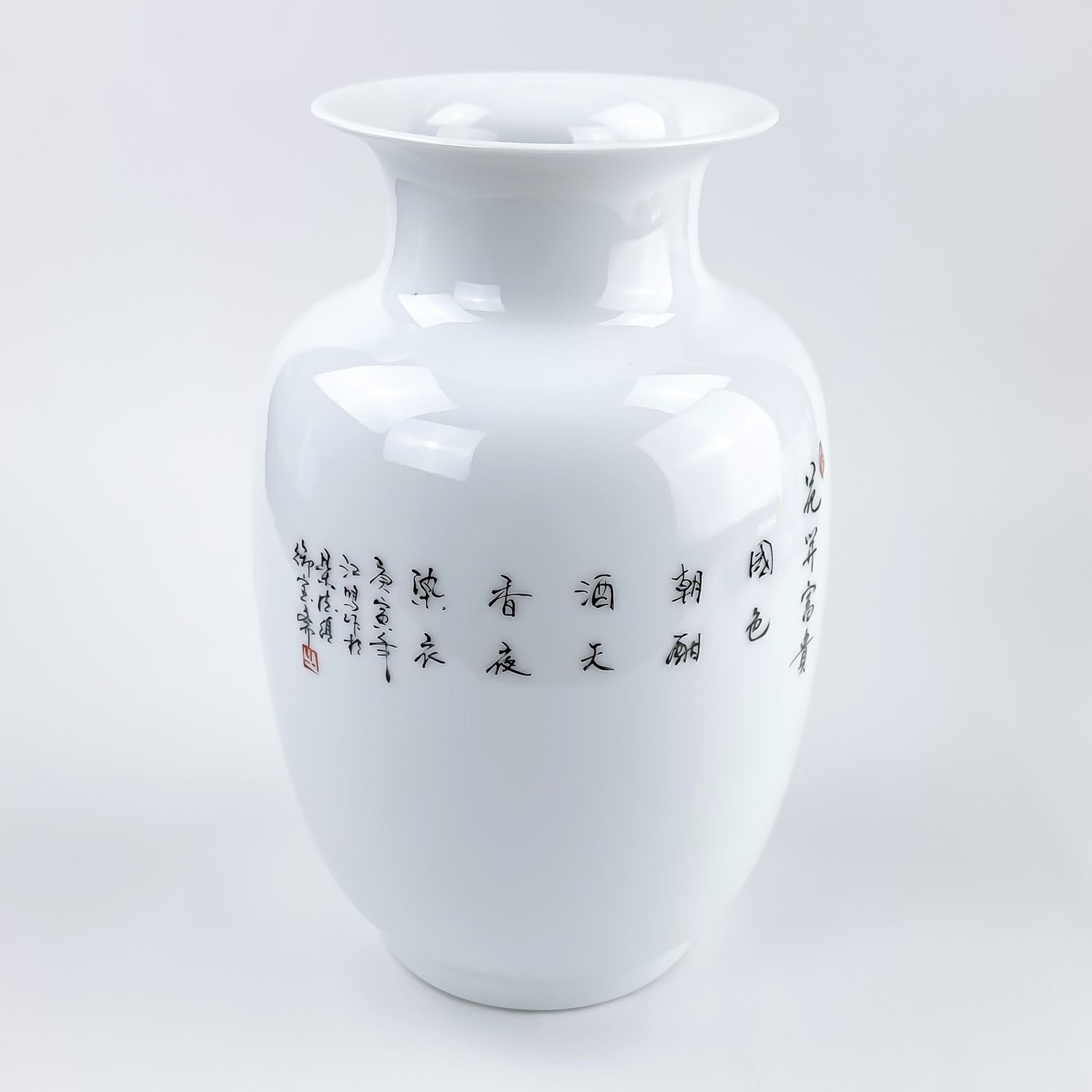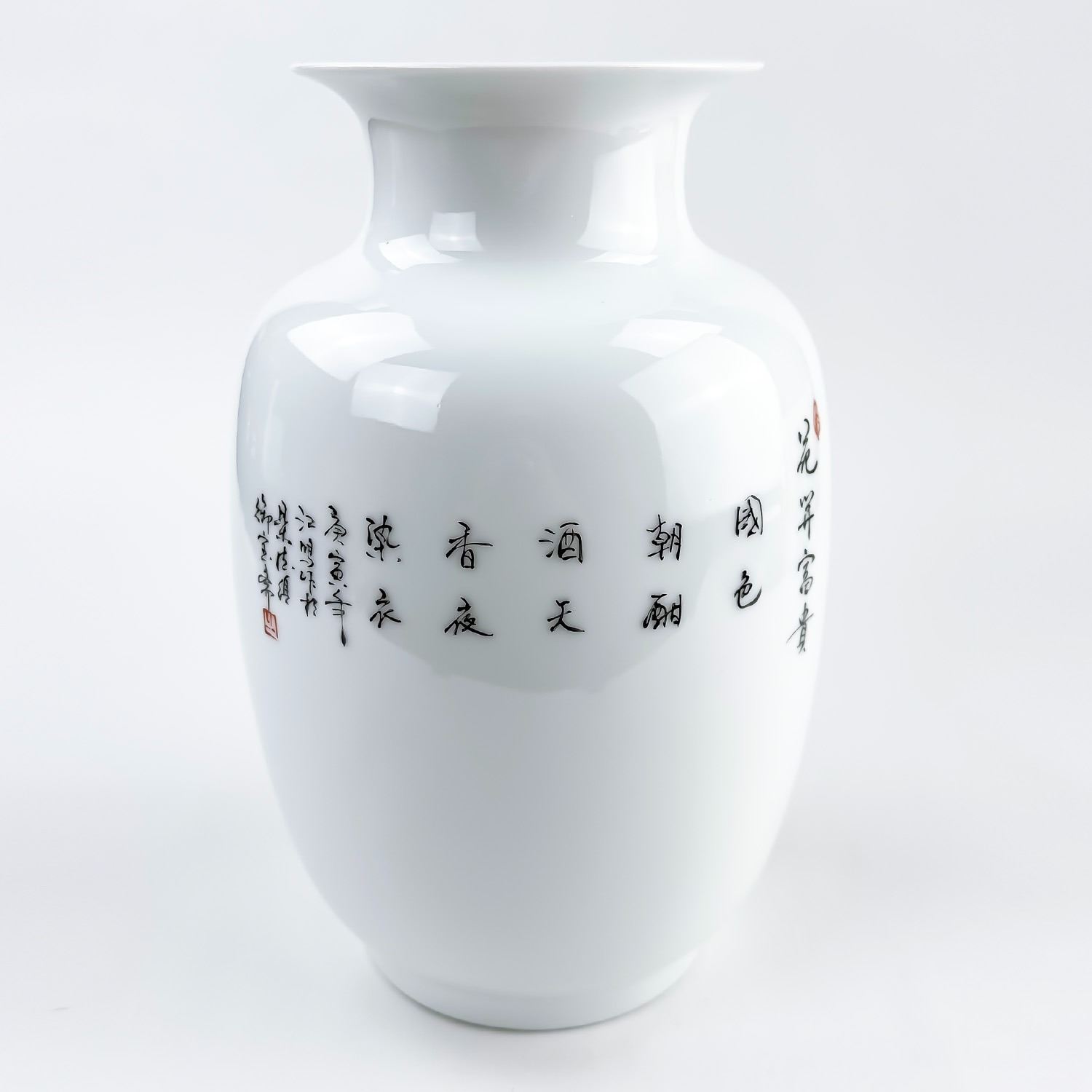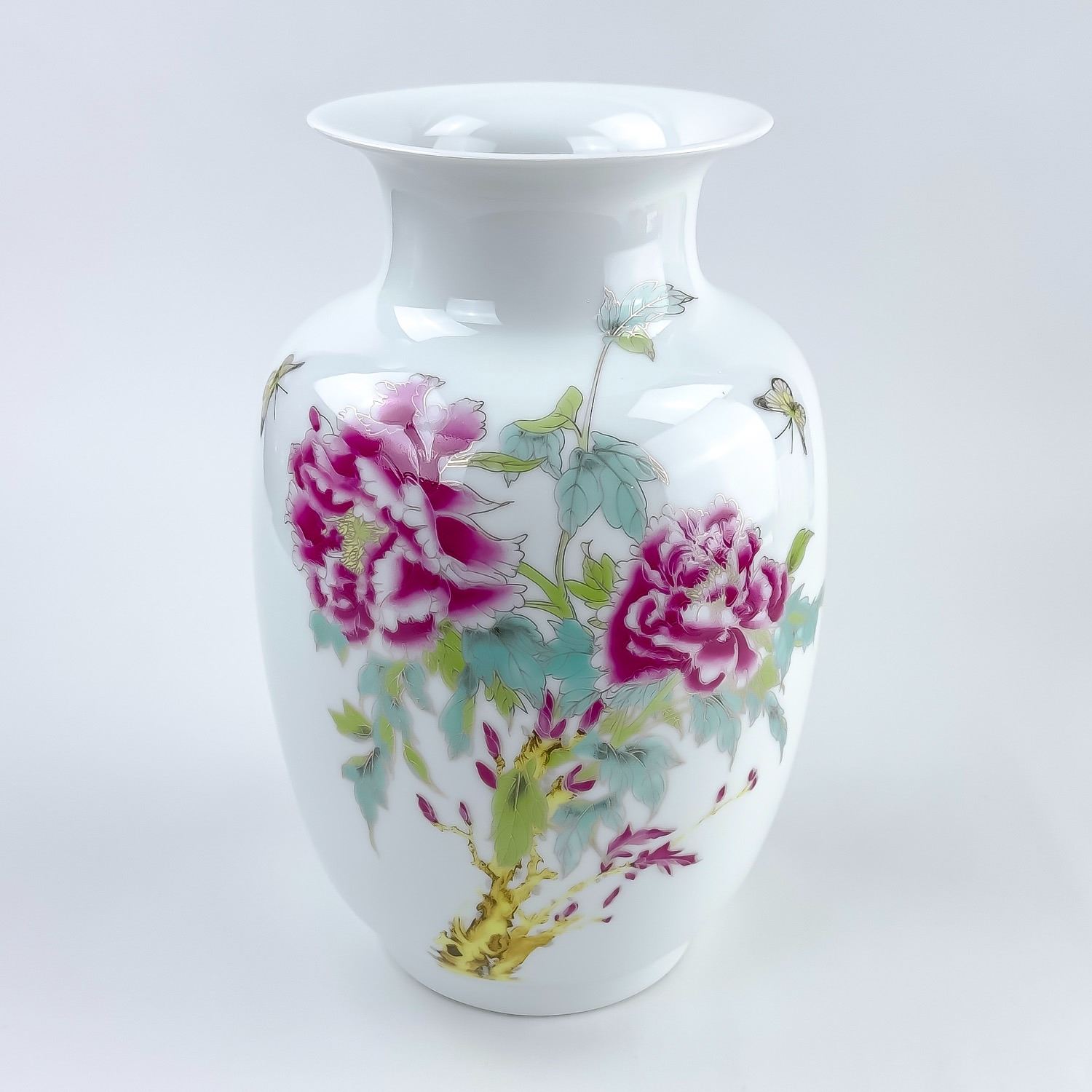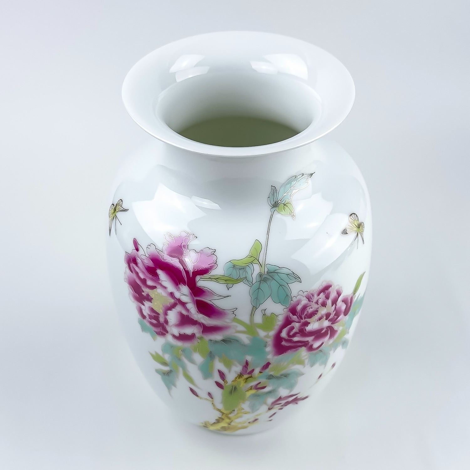 #8438 - CHINESE FAMILLE ROSE STYLE PORCELAIN FLOWER VASE. FLORAL PEONY FLOWERS WITH BUTTERFLIES DESIGN AND CHINESE CALLIGRAPHIES ON THE BACK AND BASE. EXACT AGE AND ORIGIN UNKNOWN. HOME OR OFFICE DECOR ART SCULPTURE. NO CRACKS, CHIPS OR REPAIRS. MEASURES 10.5” (27 CM) TALL BY APPROX 6.5” (16.5 CM) WIDEST DIAMETER AND 4.75” (12 CM) TOP DIAMETER. BASE DIAMETER 4” (10 CM).
