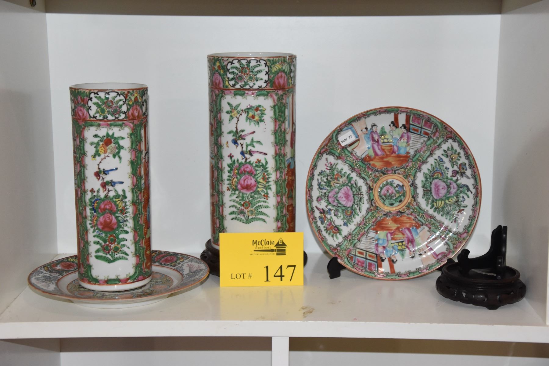 CHINESE FAMILLE ROSE TUMBLER VASES, PLATES & STANDS (4 PCS)