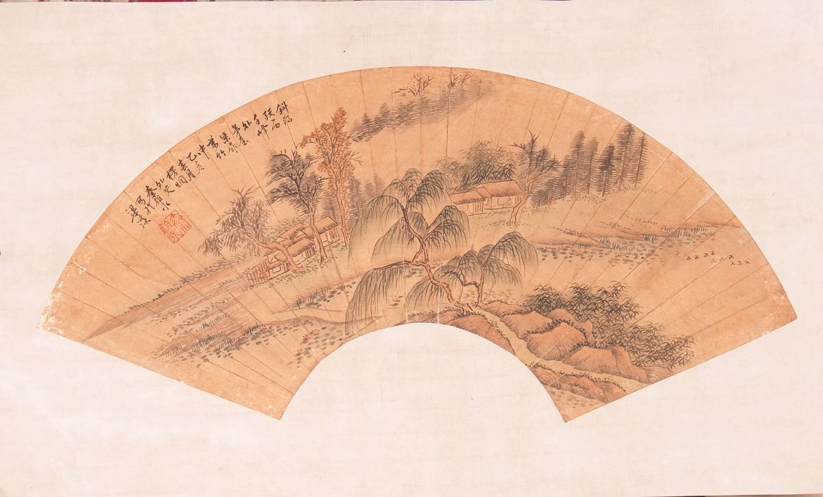 Chinese Fan-shaped Painting, Ink and Color on paper, depicting the landscape scenery of Liang Xi. Inscribed and signed after Qin Zuyong. Length 21.25" Width 7.25"