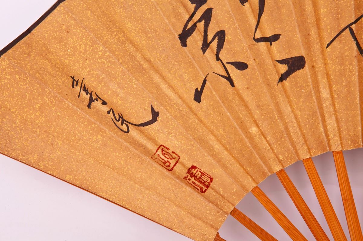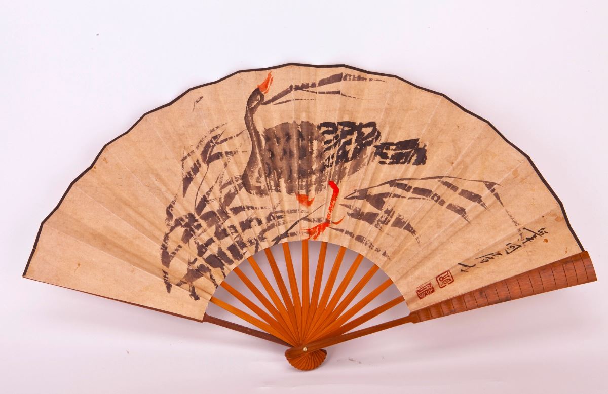 Chinese fan with ink and color painted, depicting four Chinese calligraphy characters after Shoumin and black duck on the other side. Length 13" Width 14"