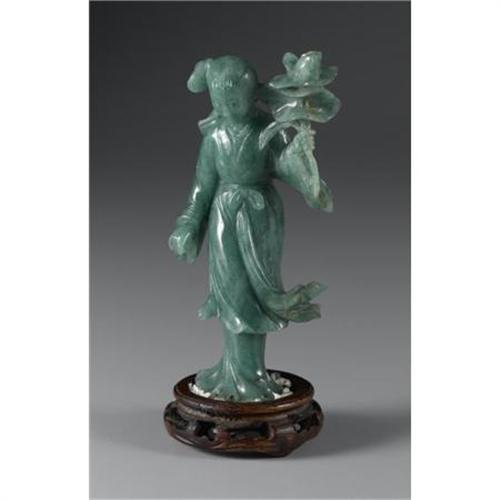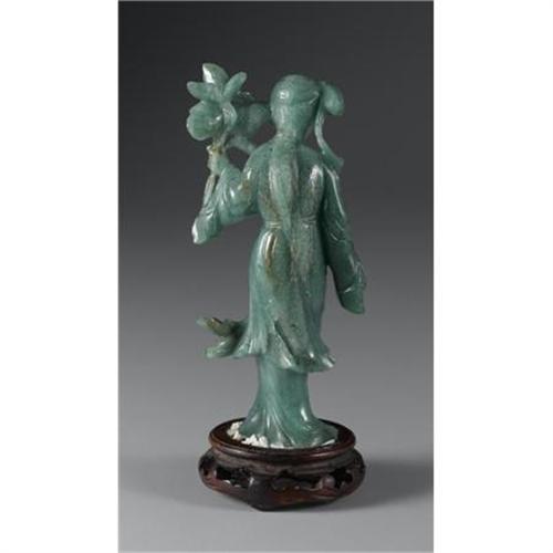 <B>CHINESE GLASS CELESTIAL BEAUTY</B></I><BR><BR>Chinese glass figure of a celestial beauty holding a lotus. Of green coloration. On a wood stand<BR>4-3/4in. high<BR><BR> <B>Condition Report:</B> Normal signs of wear as appropriate with age.<BR><BR><b>Shipping:</b> Miscellaneous Collectibles, Larg (<a target="_blank" href="http://www.heritageauctions.com/common/shipping.php">view shipping information</a>)