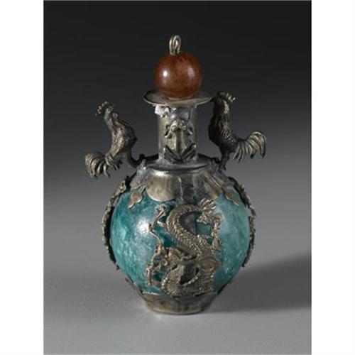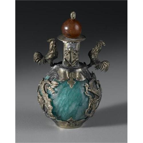 <B>CHINESE SNUFF BOTTLE</B></I><BR><BR>Chinese glass/plastic snuff bottle with silver/metal overlay of animals<BR>3in. high<BR><BR> <B>Condition Report:</B> Normal signs of wear as appropriate with age.<BR><BR><b>Shipping:</b> Bottles, Jars & Containers (<a target="_blank" href="http://www.heritageauctions.com/common/shipping.php">view shipping information</a>)