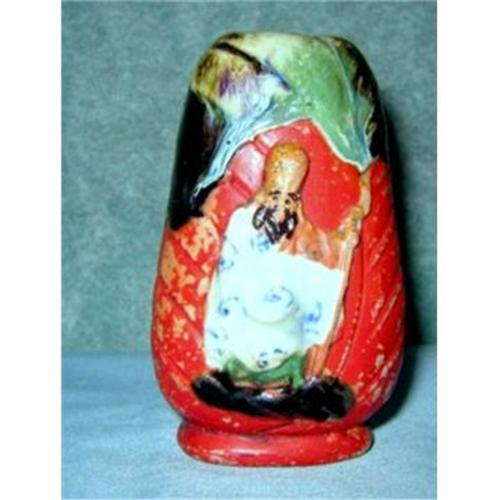 THIS IS AN UNUSUAL BUD VASE. THE TOP PORTION HAS MULTI COLOR DRIP GLAZE ENDING 1/25 OF THE WAY DOWN, THE FIGURE IS IN NATURAL CLAY WITH A GLAZED BLUE AND WHITE ROBE. THE BACKGROUND IS IN A MATT FINISHED RED GLAZE. VERY NICE AND VERY UNUSAUL. THIS WORK IS KNOWN AS SUMIDA GAWA.