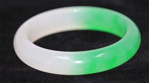 CHINESE GREEN AND WHITE JADE BANGLE; DIAMETER 2.5 IN **|**|** CHINESE GREEN AND WHITE JADE BANGLE; DIAMETER 2.5 IN ; MSRP: $0