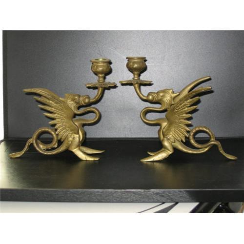A pair of early 1900's brass candleholders in the form of griffins ( could be phoenix, but these birds look a little less gracefull ). I believe that they are chinese in origin !