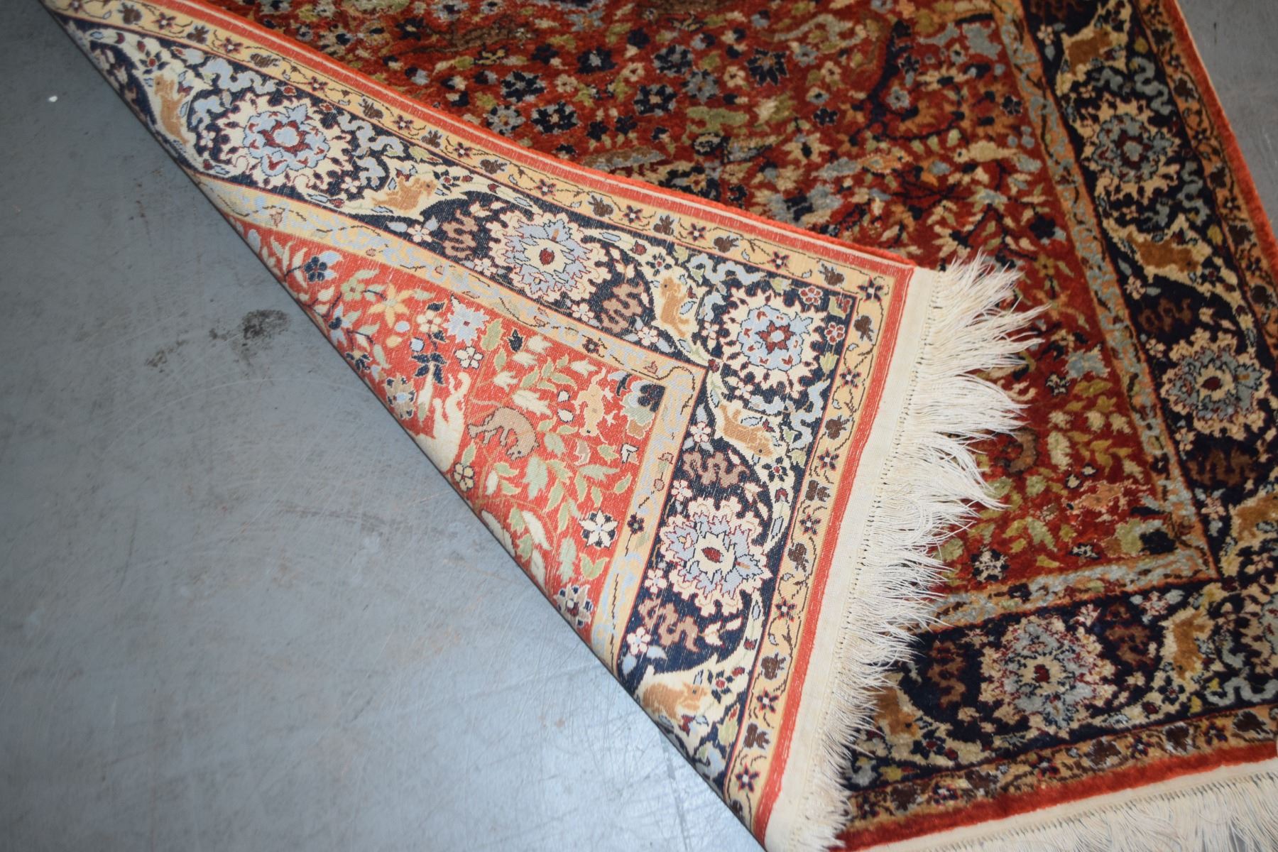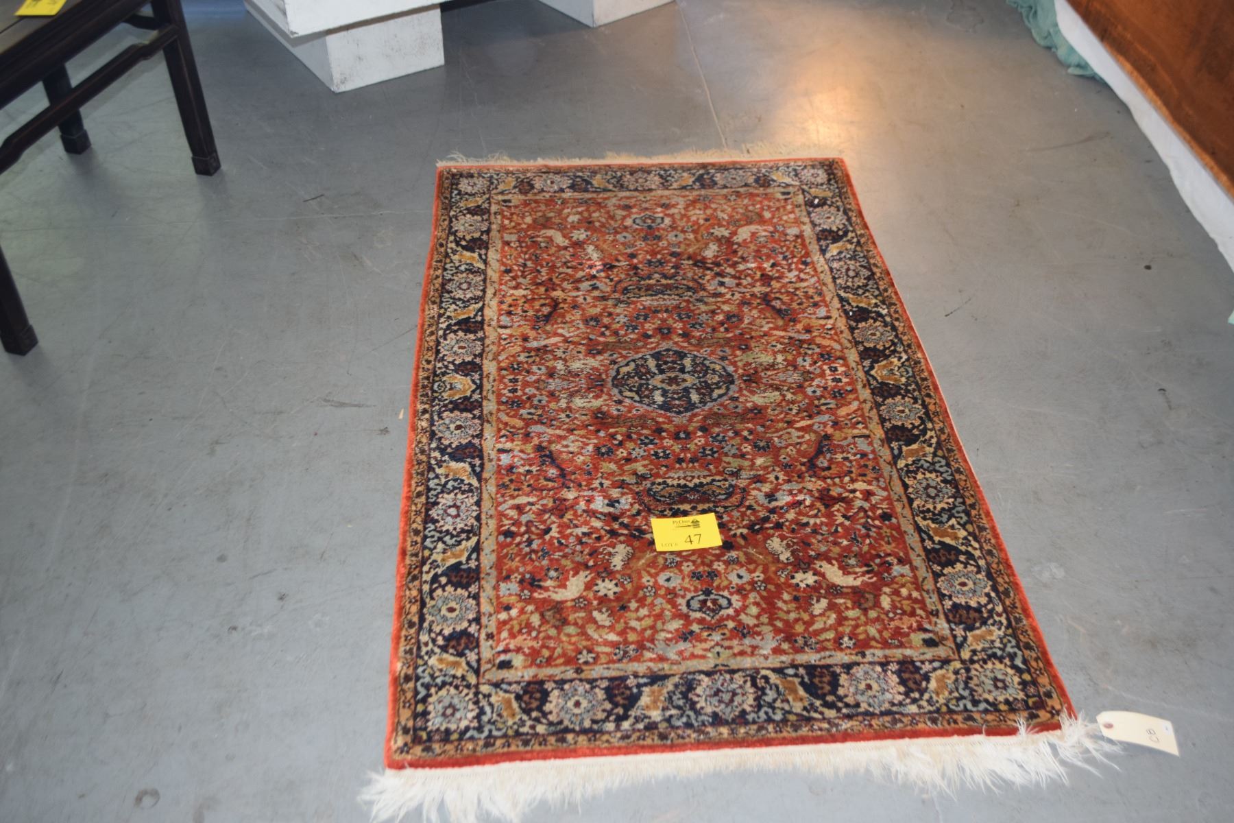 CHINESE HAND KNOTTED SILK PILE RUG, THE DEEP BRICK RED FIELD W/A CENTRAL SMALL DEEP BLUE MEDALLION FILLED W/ANIMALS & FLOWERS, SURROUNDED BY NUMEROUS ANIMALS & FLOWERS, ENCLOSED BY A DEEP BLUE GROUND BOARDER W/SCROLLING FLORAL VINES (3' 1" X 5' 1")