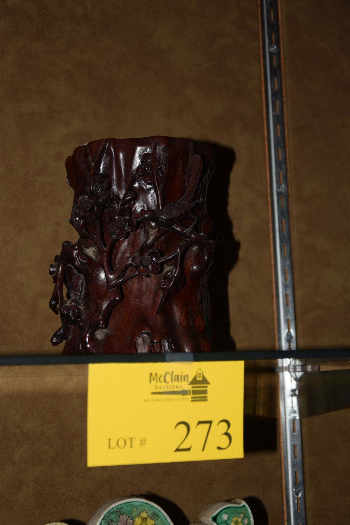 CHINESE HARDWOOD BRUSH POT HIGH RELIEF PRUNUS (BITUNG) (5 1/2" D X 6 1/2 H)