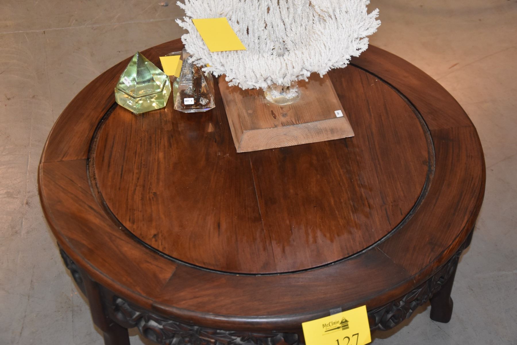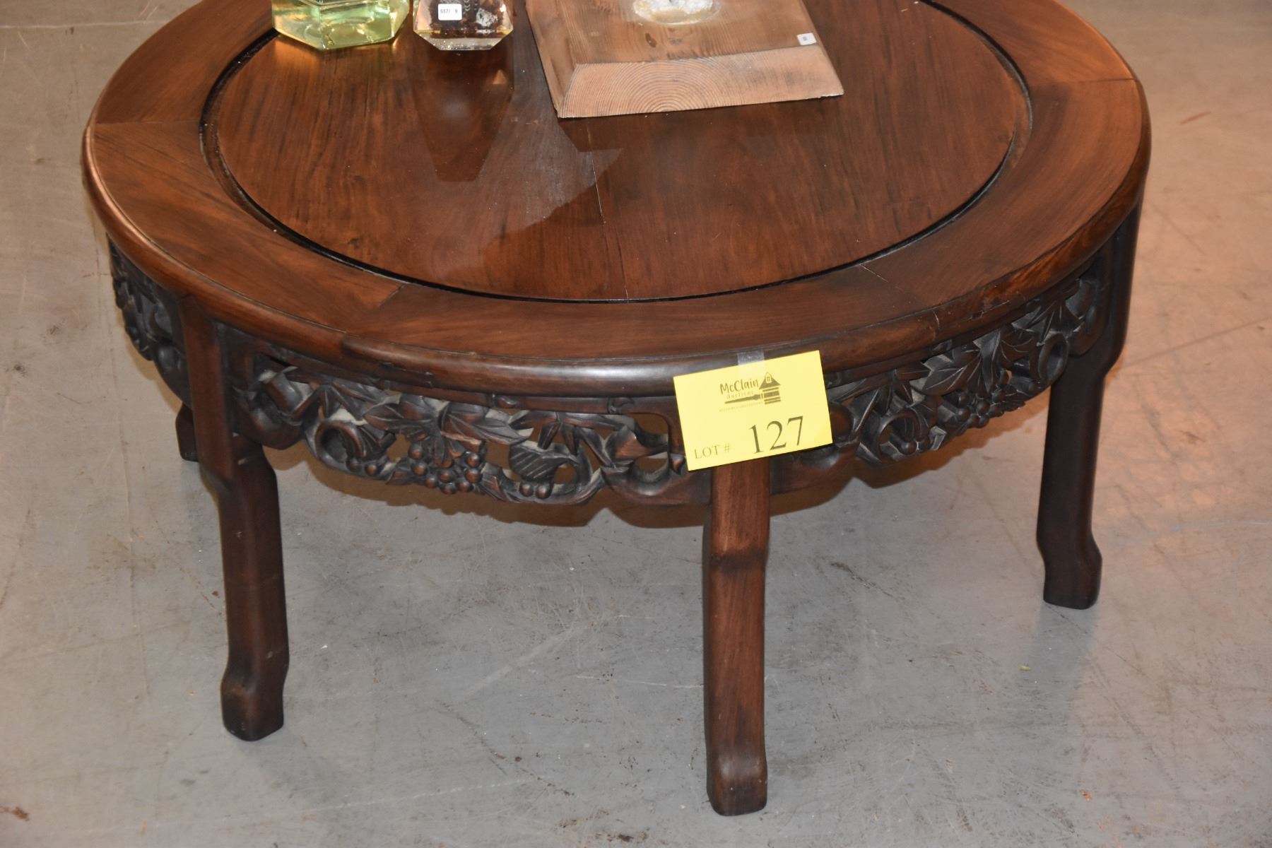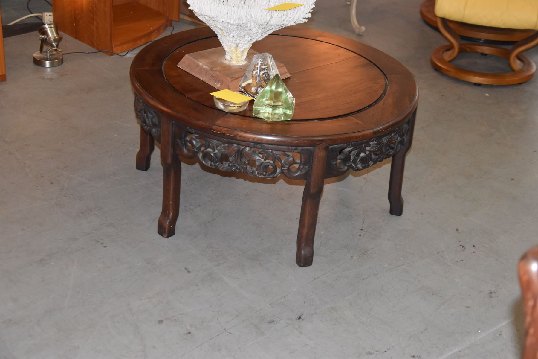 CHINESE HARDWOOD ROUND COFFEE TABLE, OPENWORK APRON (16" X 33")