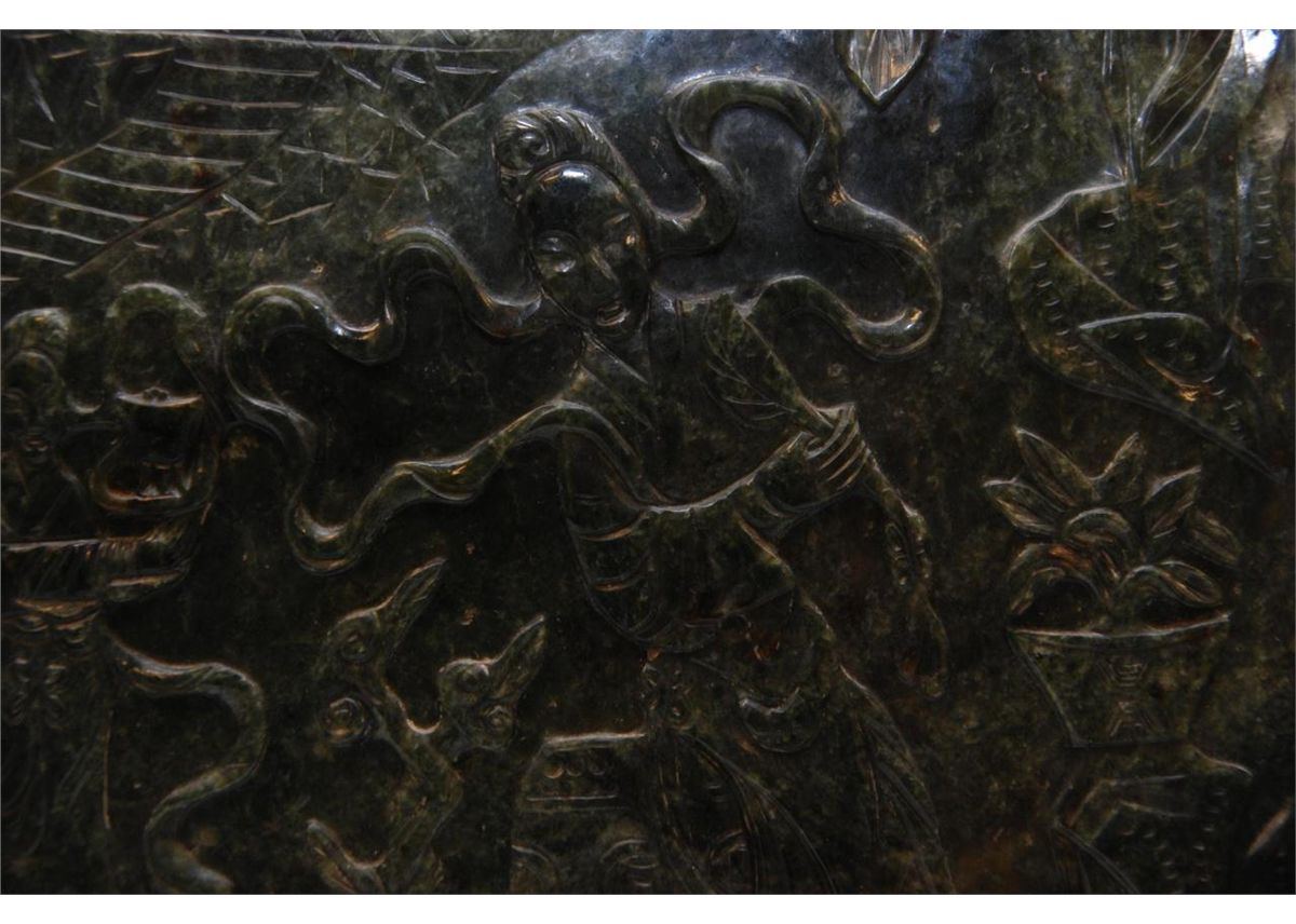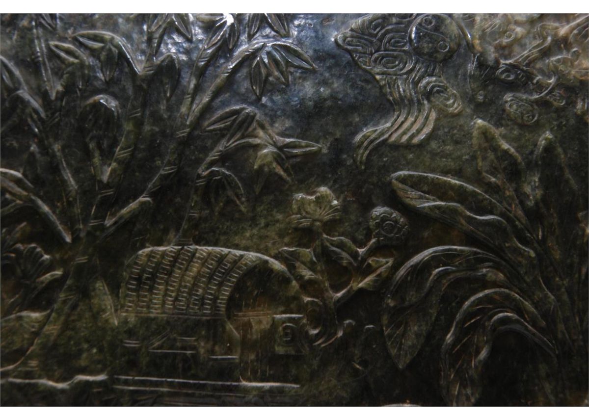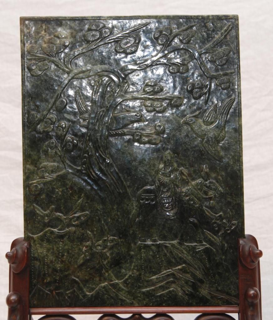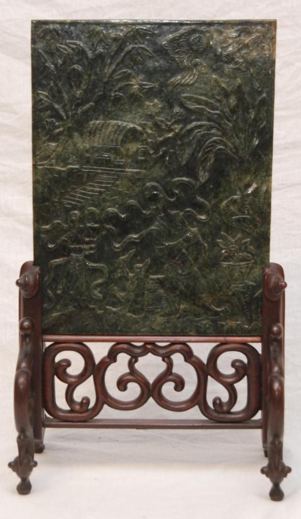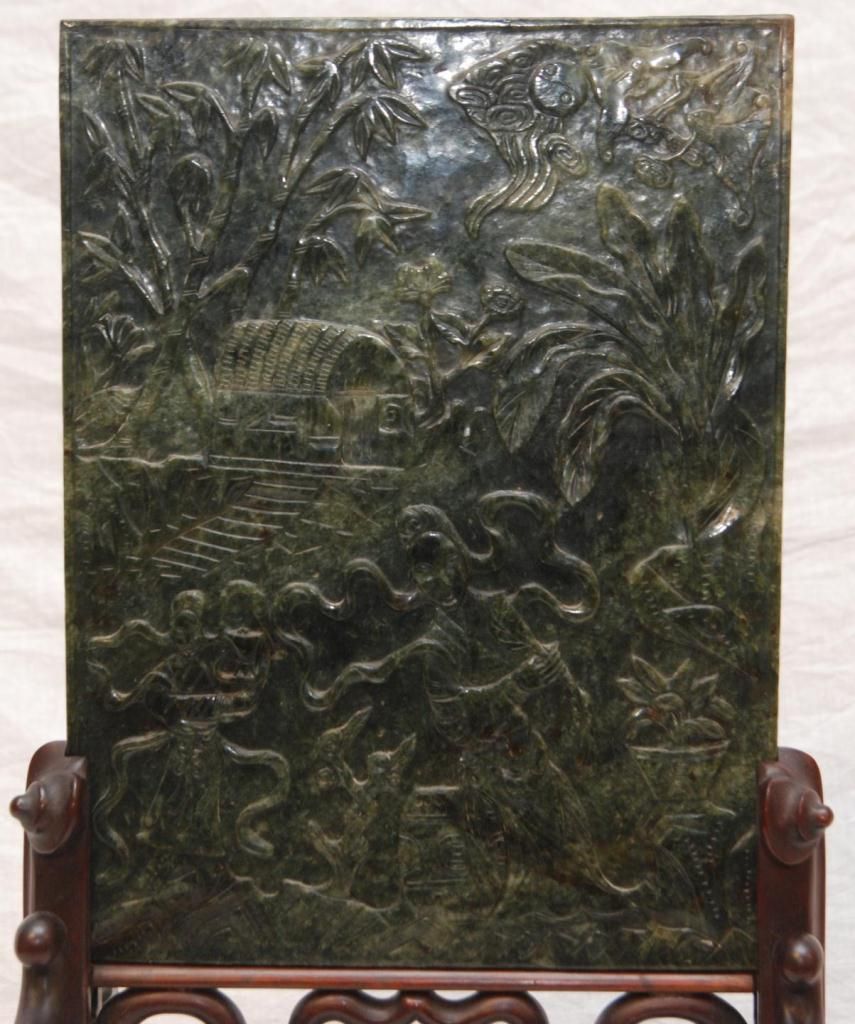 The dark mottled material high relief carved on one side with a beauty seated on a garden stool. Her attendant by a pavilion in landscape. The reverse carved with a traveler on horseback in landscape. Fitted wooden stand. Measures 13 1/4" height x 10" width + 6 1/2" base height (33.6cm x 25.4cm + 16.5cm). Jade weight of 2.02 kilograms. Provenance: Christie's East March 24, 1998 Asian Decorative Arts sale, lot 69.