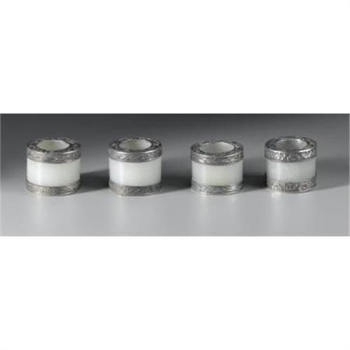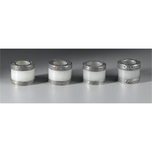 <B>CHINESE JADE/HARDSTONE ARCHER RINGS</B></I><BR><BR>Four Chinese jade/hardstone archer rings mounted with silver foliate rims and bases<BR>1in. high<BR><BR> <B>Condition Report:</B> Normal signs of wear as appropriate with age.<BR><BR><b>Shipping:</b> Miscellaneous Collectibles, Larg (<a target="_blank" href="http://www.heritageauctions.com/common/shipping.php">view shipping information</a>)