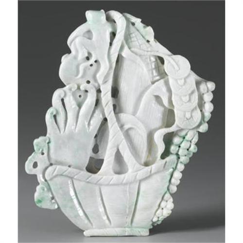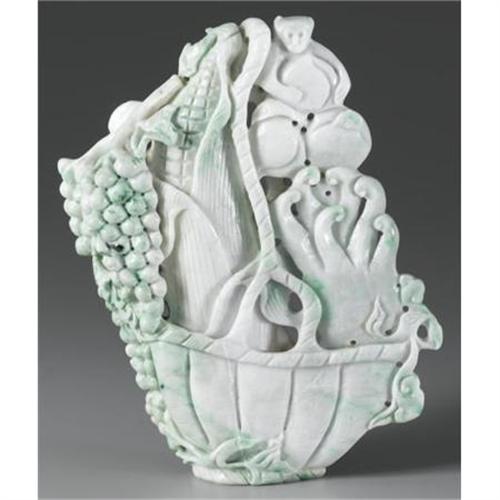 <B>CHINESE JADE/HARDSTONE OPENWORK GROUP</B></I><BR><BR>Chinese jade/hardstone openwork group, depicting a basket with grapes, a corn husk, Buddha's Hand, peaches, taels and a monkey. Of mottled pale green and bright green coloration with small spinach green suffusion<BR>8-1/2in. high x 7in. wide<BR><BR> <B>Condition Report:</B> Normal signs of wear as appropriate with age.<BR><BR><b>Shipping:</b> Requires 3rd Party Shipping (<a target="_blank" href="http://www.heritageauctions.com/common/shipping.php">view shipping information</a>)