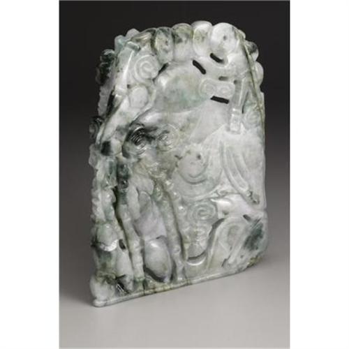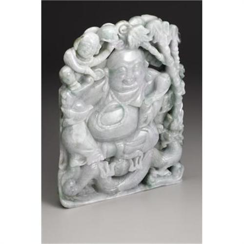 <B>CHINESE JADE/HARDSTONE PLAQUE</B></I><BR><BR>Chinese jade/hardstone openwork plaque of a seated Budai holding a scepter and tael, surrounded by a dragon, flaming pearl, attendant, and foliage. Of green coloration<BR>7-7/8in. high<BR><BR> <B>Condition Report:</B> Normal signs of wear as appropriate with age.<BR><BR><b>Shipping:</b> Miscellaneous Collectibles, Larg (<a target="_blank" href="http://www.heritageauctions.com/common/shipping.php">view shipping information</a>)