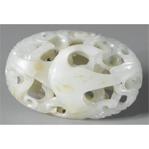 <B>CHINESE JADE/HARDSTONE TOGGLE</B></I><BR><BR>Chinese jade/hardstone toggle, with bird to one side. Of light celadon coloration with light rust suffusions<BR>2-3/4in. long x 1-3/4in. wide<BR><BR> <B>Condition Report:</B> Normal signs of wear as appropriate with age; some small losses to the reverse.<BR><BR><b>Shipping:</b> Requires 3rd Party Shipping (<a target="_blank" href="http://www.heritageauctions.com/common/shipping.php">view shipping information</a>)
