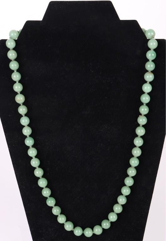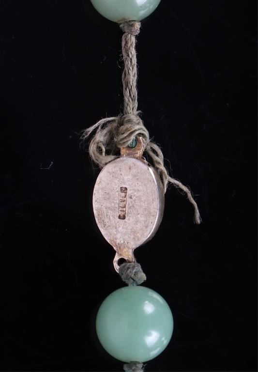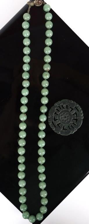 Chinese green jade beaded necklace with one imperial jade carved pendant. Necklace has a silver clasp.