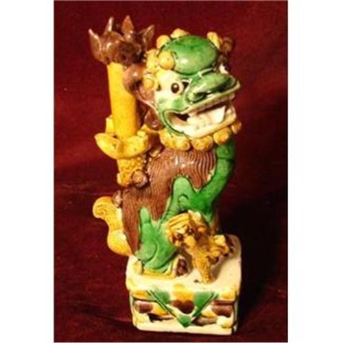 Circa 1700 Chinese Kangxi Period Famille Verte Porcelain Joss Stick Holder measuring 6 1/4" in height and the rectangular plinth is 2 1/4" X 1 1/2". It is modelled in the form of a Buddhistic Lion and its young on a rectangular plinth, , with the base being unglazed and fired slightly orange. Good Condition with only a few minor chips having been restored. Unusual Chinese pieces of this age are VERY RARE and very rarely appear on the market. Additional images are available upon request. People in China are looking for pieces like this, which is their heritage and 300 year old pieces like this, regardless of size, and in this wonderful condition are Very Rare--and are very desireable and much in demand. As mentioned before additional images are available upon request.