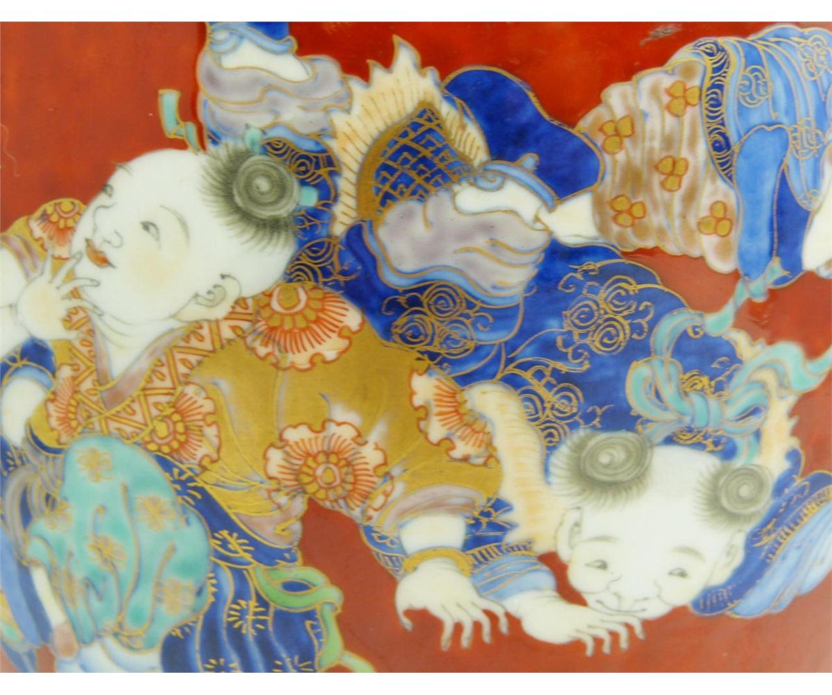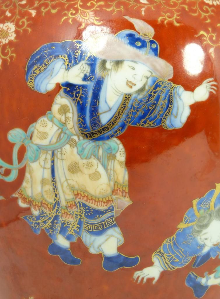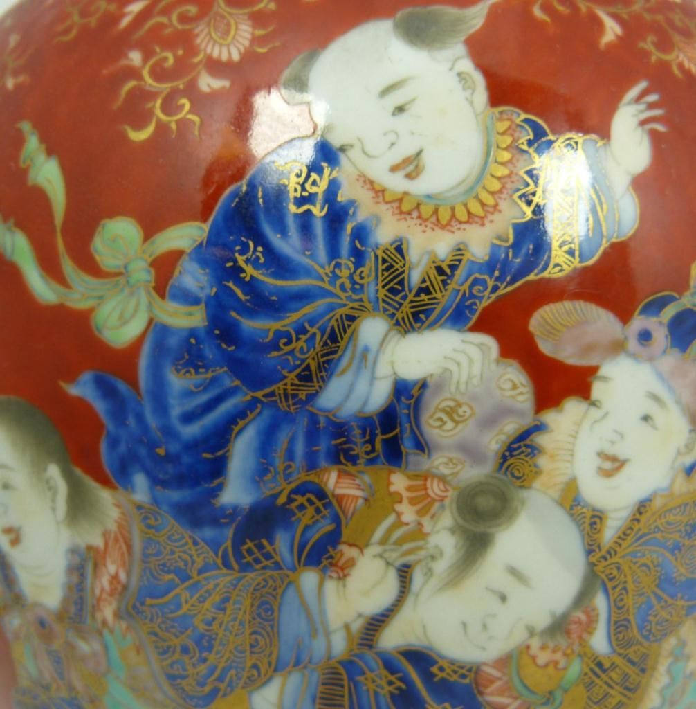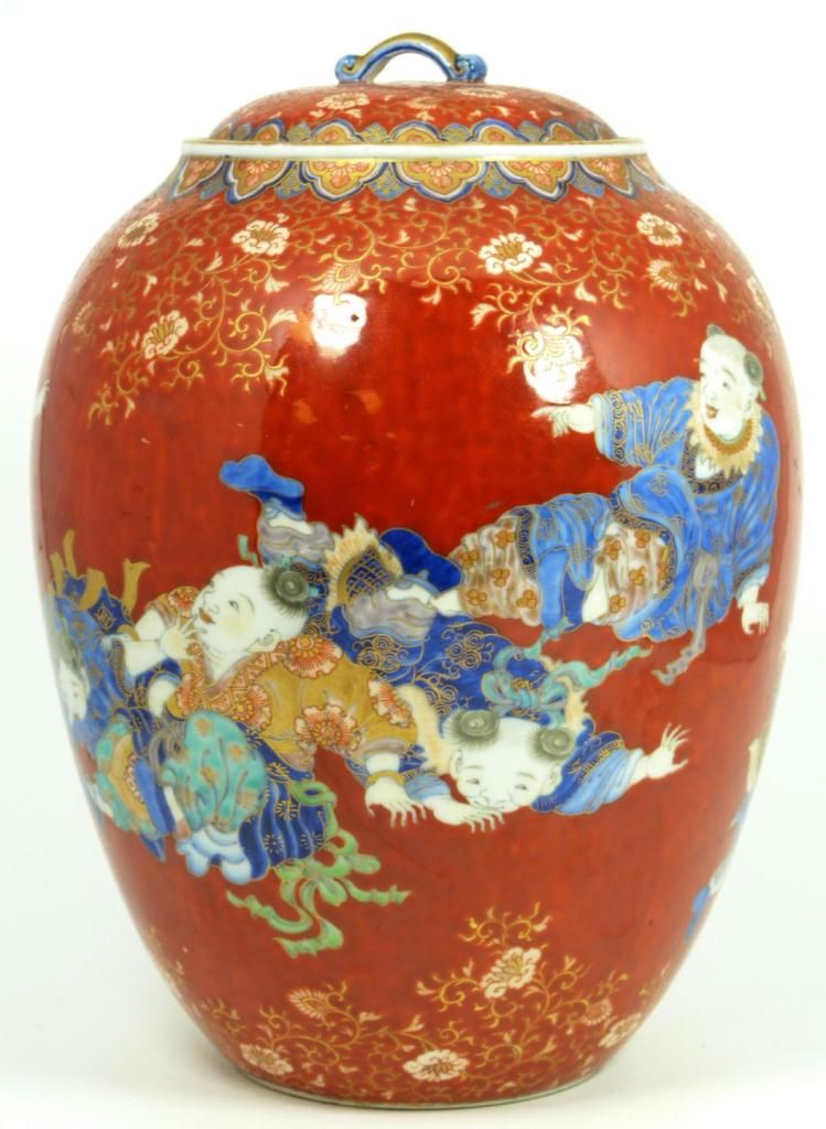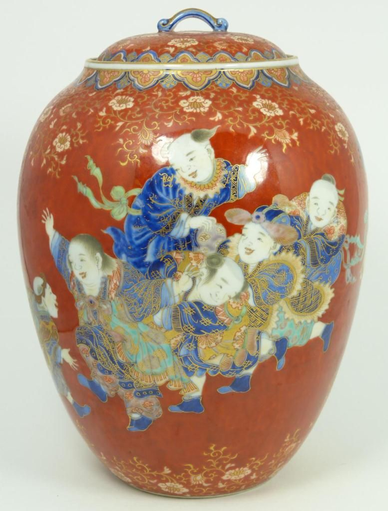 Old Chinese hand painted lidded ginger depicting numerous children running and playing. Fine scrolled floral design and leaves borders all over red ground. 19th/20th century. Measures 9 5/8" height x 7 5/8" diameter (24.4cm x 19.3cm). Total weight of 1387 grams.