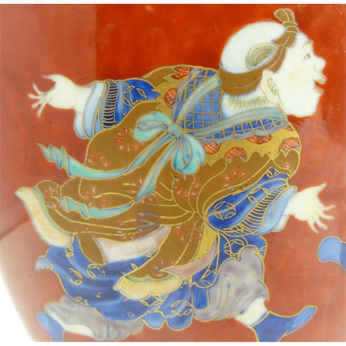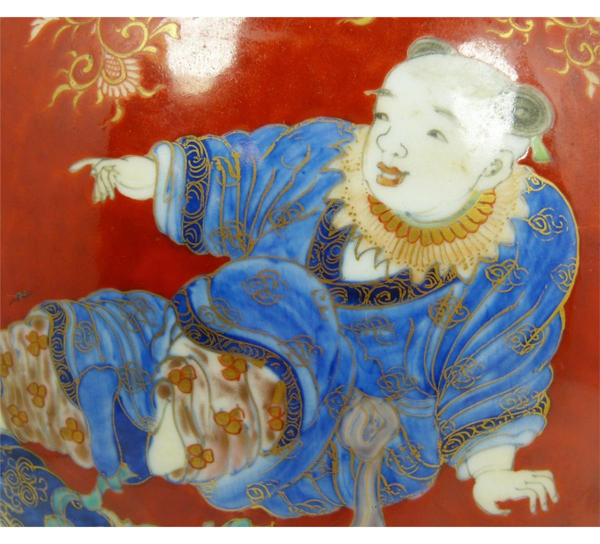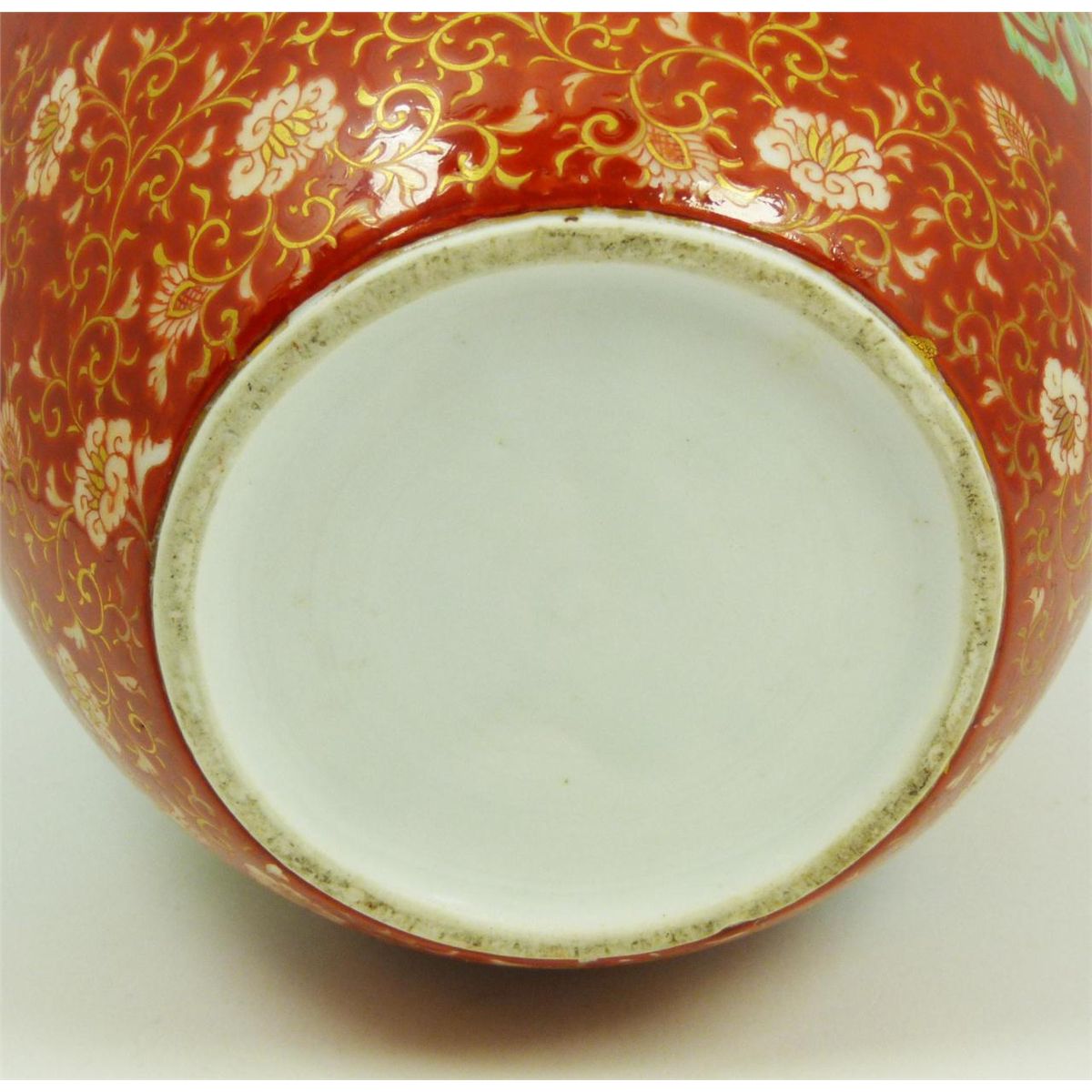 Old Chinese hand painted lidded ginger depicting numerous children running and playing. Fine scrolled floral design and leaves borders all over red ground. 19th/20th century. Measures 9 5/8" height x 7 5/8" diameter (24.4cm x 19.3cm). Total weight of 1387 grams.