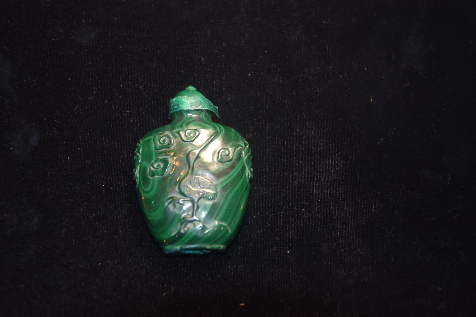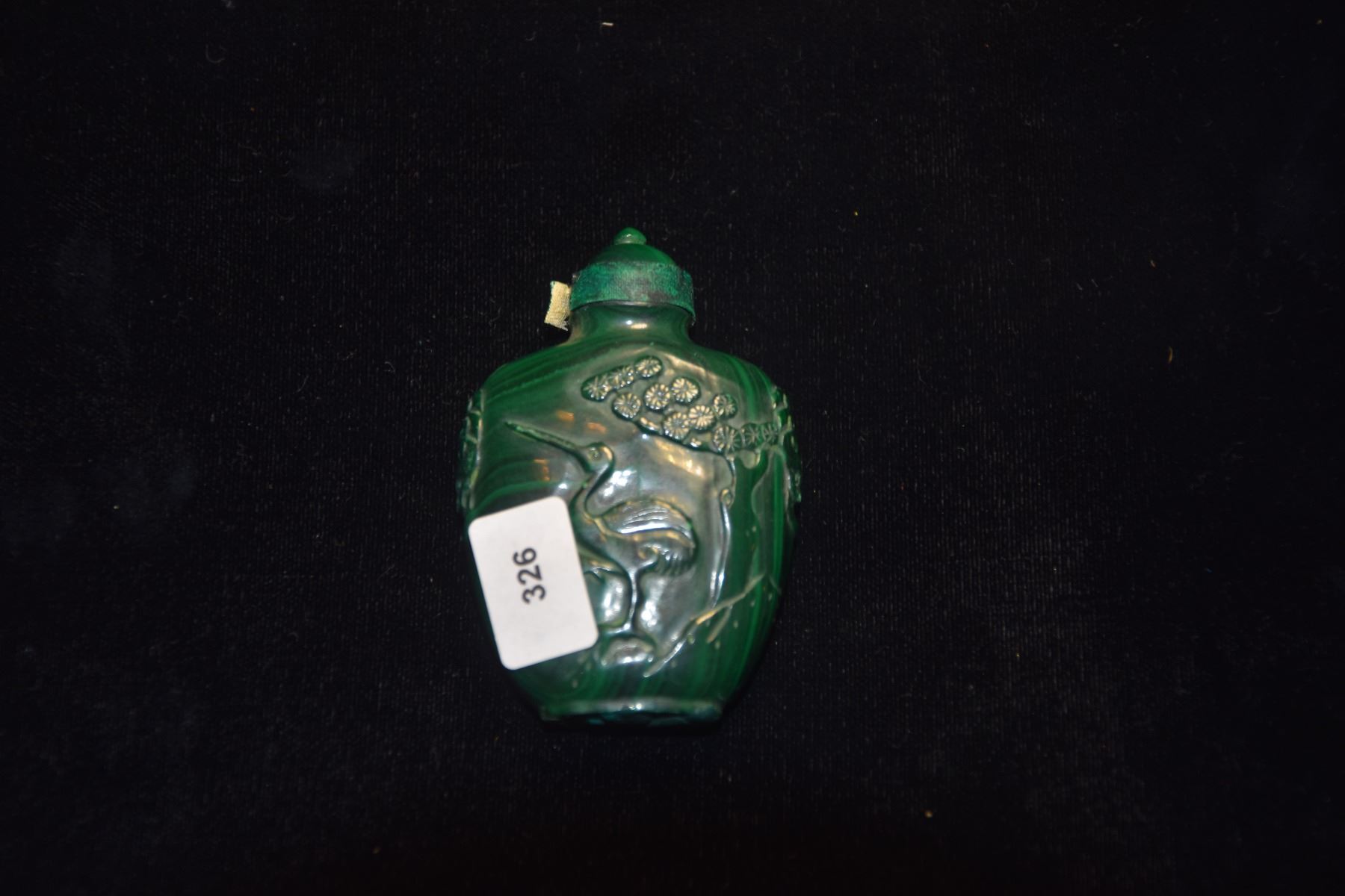 CHINESE MALACHITE SNUFF BOTTLE W/CARVED CRANE & PINE MOTIF
